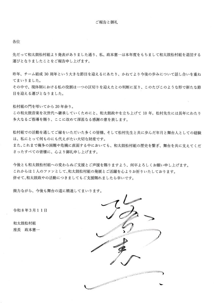 先だって和太鼓松村組より発表がありました通り、私、政本憲一は本年度をもちまして和太鼓松村組を退団する運びとなりましたことをご報告申し上げます。