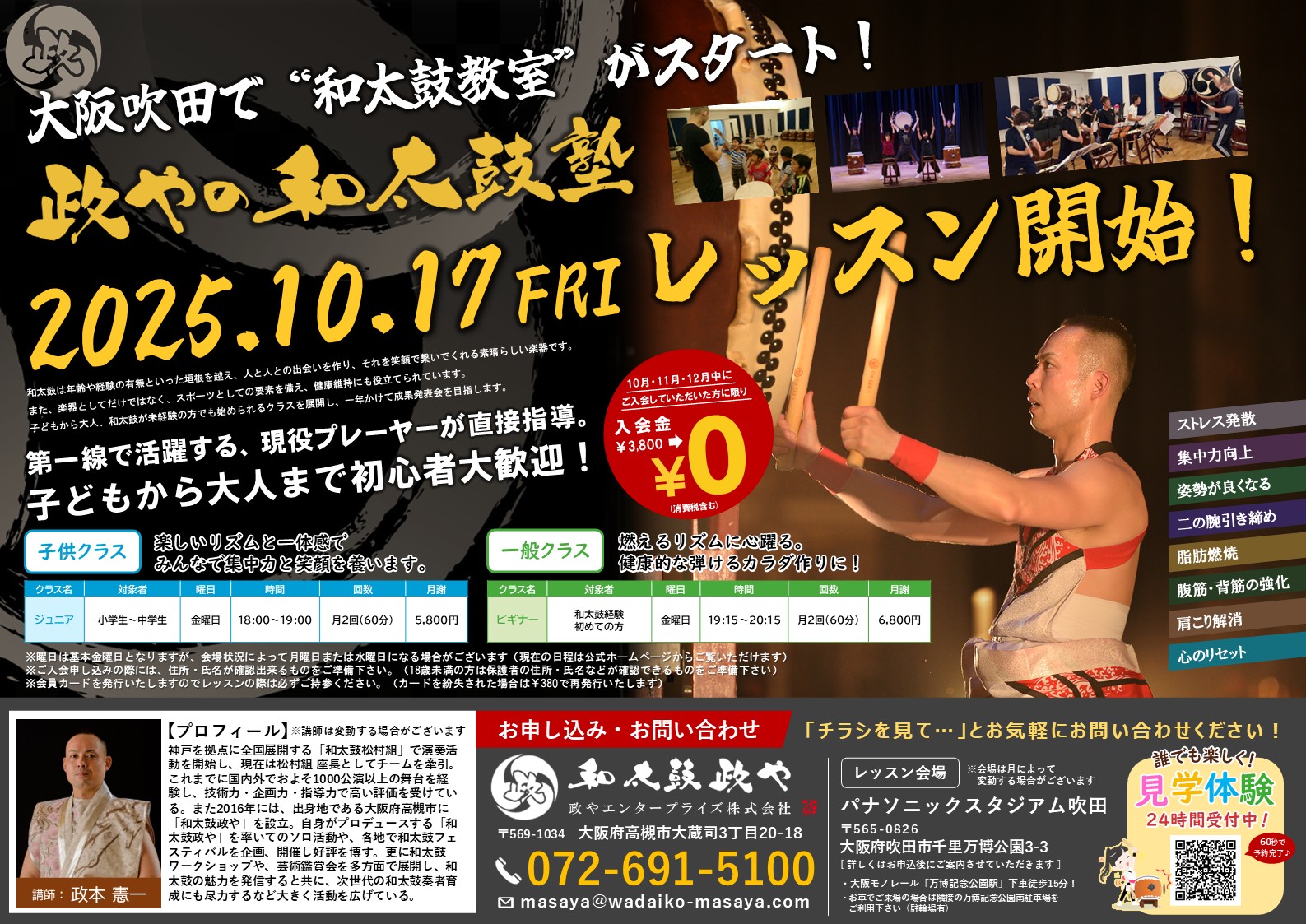 政やの和太鼓塾【吹田】 ▼体験申し込み・お問い合わせ お名前 (必須) 年齢 (必須) メールアドレス (必須) 電話番号 (必須) お問い合わせ和太鼓塾 (必須) ジュニアビギナー 認知経路 (必須) ポスティングチラシ現地建物ポスター政や会員公式ホームページSNS知人紹介その他 お問い合わせ内容(体験希望,入会希望など) 入力完了後(確認)チェックを入れて「送信」ボタンをクリックして下さい。 確認 Δ