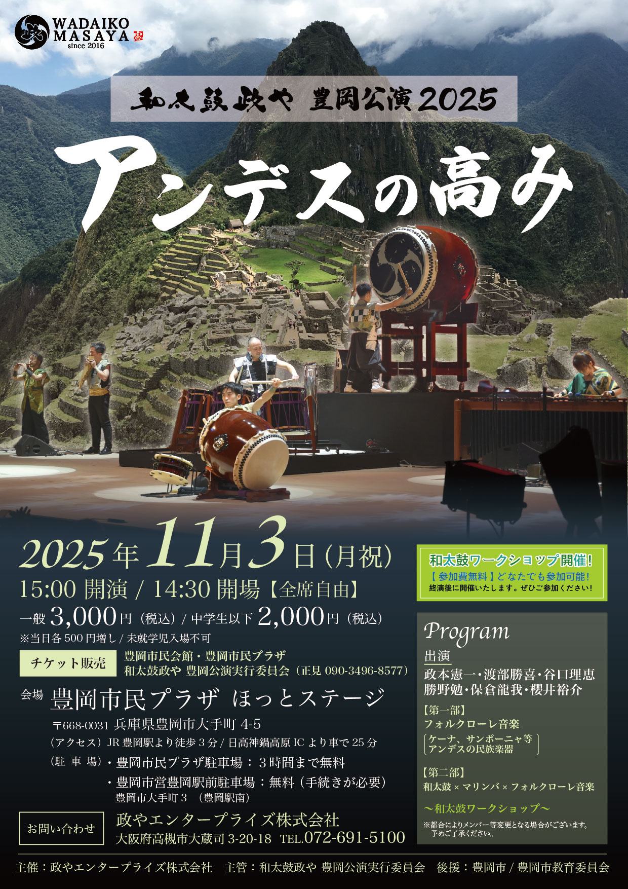 | 主催 | 政やエンタープライズ株式会社 主管:和太鼓政や 豊岡公演実行委員会 後援:豊岡市 / 豊岡市教育委員会 |